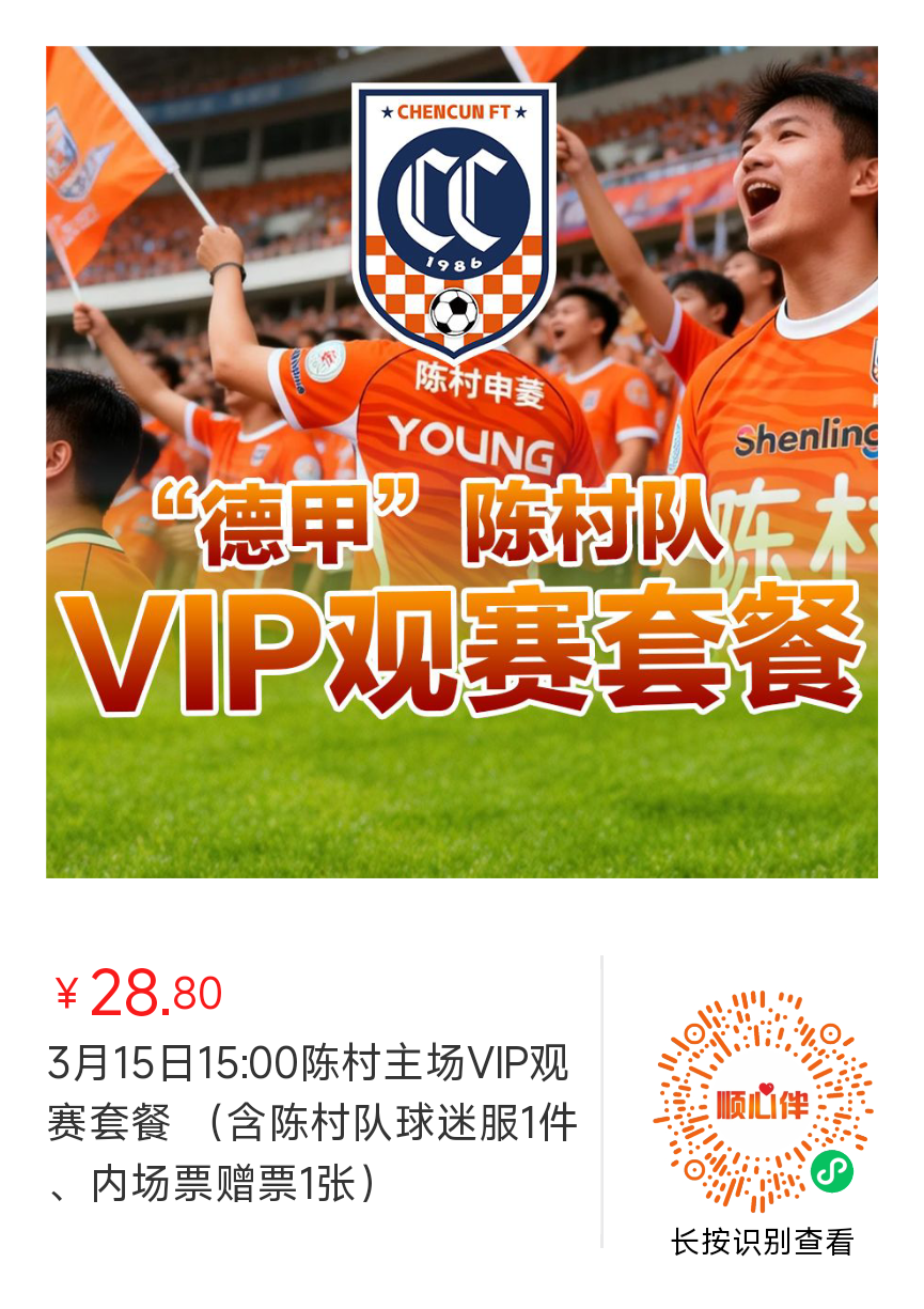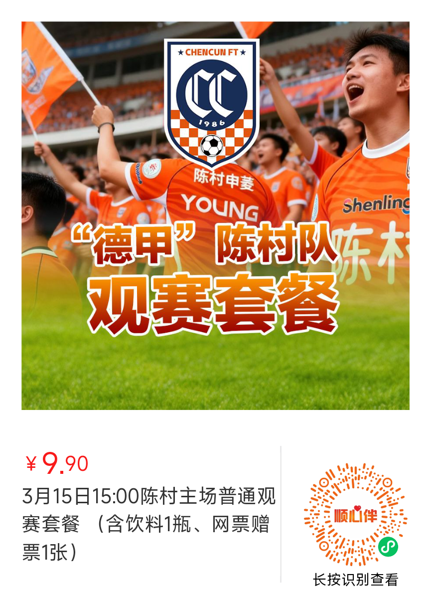 门票正式开售!3月15日(本周日)一场绿茵盛宴即将上演陈村主场迎战乐从两大劲旅碰撞巅峰对决,不容错过主场对决花YOUNG陈村队首秀对阵双方花YOUNG陈村队(陈村申菱队)VS乐从德食队观赛时间3月15日(周日)13:00观众开始入场14:30截止进场赛事流程14:00-14:30 挑战赛15:00-17:00 冠军赛比赛场地陈村镇玉带公园11人足球场扫码观看...